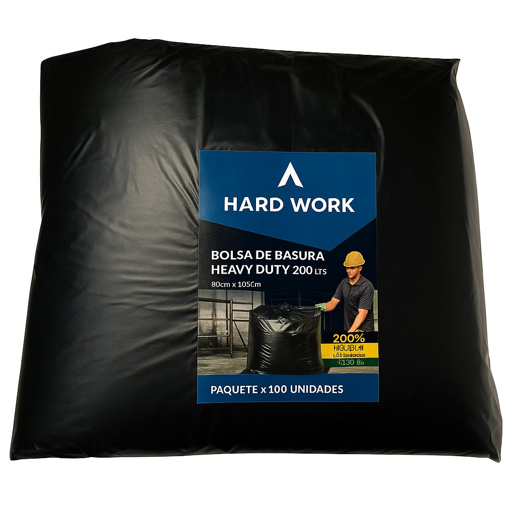 Marca / Fabricante: Hard Work Capacidad: 200 litros Ancho: 38” Largo: 48” Color: Negro Espesor: 1 micra Material: Polietileno reciclado de baja densidad (PEBD Reciclado) Densidad: Baja Tipo de sello: Sello en fondo resistente Rango de tolerancia: ± 5 % Presentación: Paquete de 100 unidades Uso recomendado: Recolección de residuos generales o de gran volumen Compatibilidad: Contenedores de 180 a 240 L