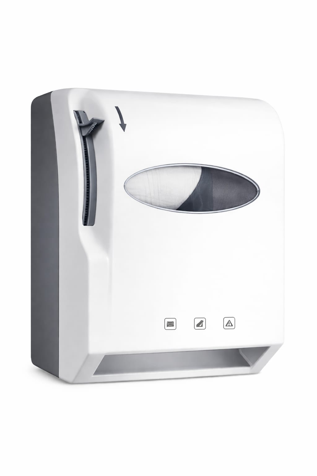 Dispensador de papel toalla de accionamiento manual mediante palanca lateral, diseñado para un suministro controlado y eficiente del papel. Fabricado en material plástico de alta resistencia, apto para uso continuo en ambientes de alto tránsito. Incorpora visor frontal para control visual del nivel de papel y sistema de fácil recarga. Su diseño compacto y funcional permite una instalación sencilla en muros, garantizando higiene, durabilidad y reducción del consumo.